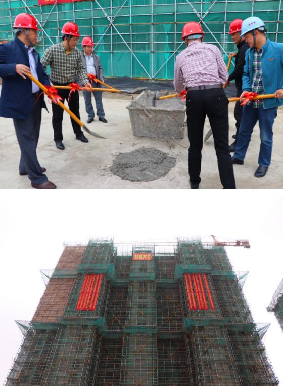 2019年5月16日上午8点18分,高邮水建承建的沄溪书院9#楼主体封顶仪式正式开始。水投集团副总经理刘广游、水建公司总经理李进、党总支书记费庆升、副总经理张文斌,鑫鹏置业有限公司副总经理朱贺,金泰建设监理有限公司总监胡佃国等人员参加了封顶仪式。